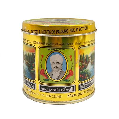 Of these perfumed black snuffs, Anarkali is especially pungent. The silky black snuff is exploding with nicotine, floral essentials, and menthol. Stronger tasting than "Special" and "Motia" actually.
