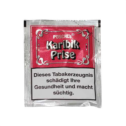 Poschl Karibik Prise is a Mentholated snuff that has a musky slightly earthy scent from the bag. If there is any Fruit notes to this one they are on the light side and would not consider this a stong Fruit offering. Grind is about Medium and is easy to take. Has fairly good longevity and a decent Menthol blast. Very happy with this Snuff and only regret not getting more than this 10g bag.